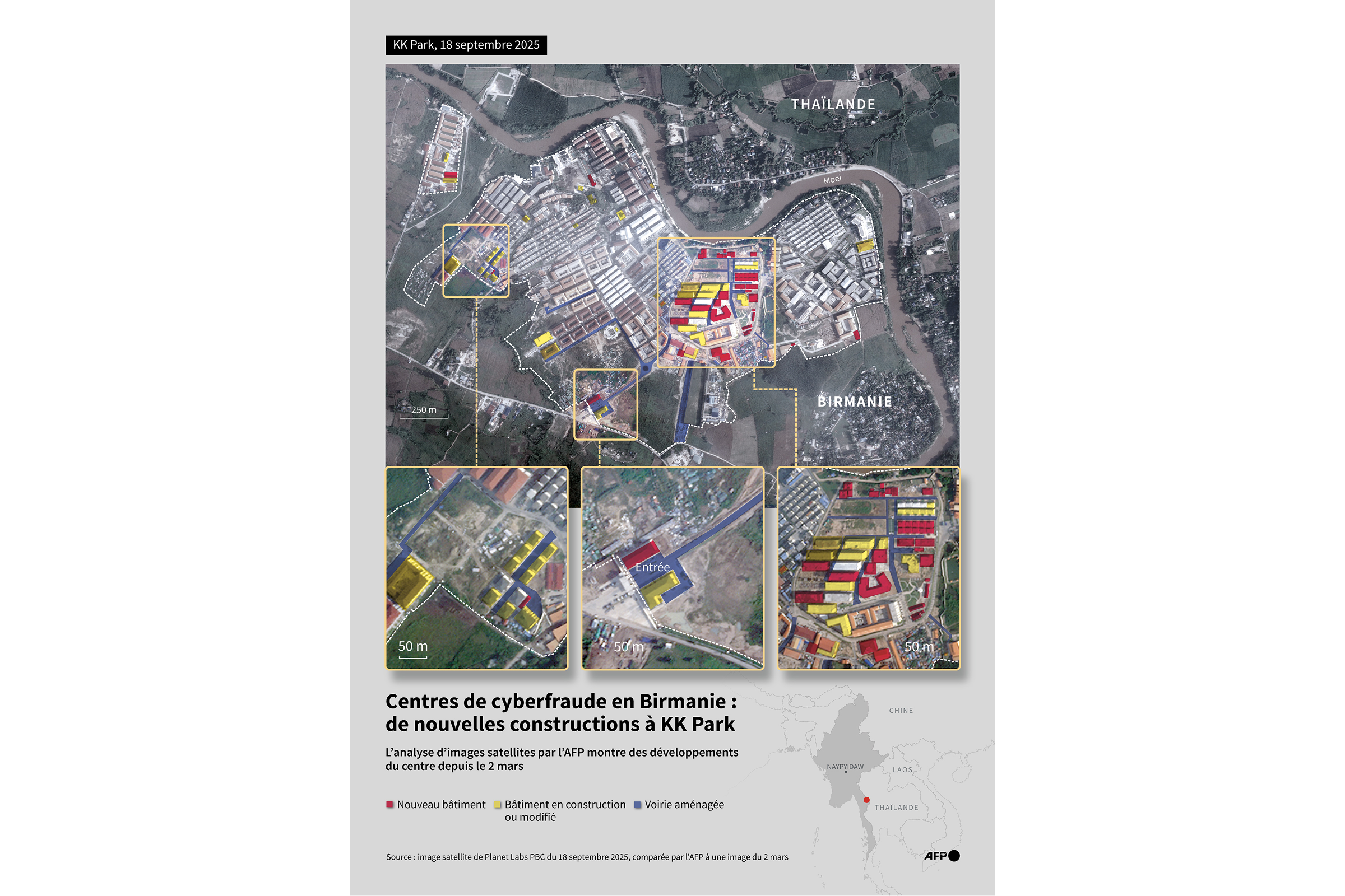 Image satellite de Planet Labs PBC de KK Park en Birmanie, près de la frontière avec la Thaïlande, soulignant les nouvelles constructions entre le 2 mars 2025 et le 18 septembre 2025. © Sabrina Blanchard / PLANET LABS PBC / AFP