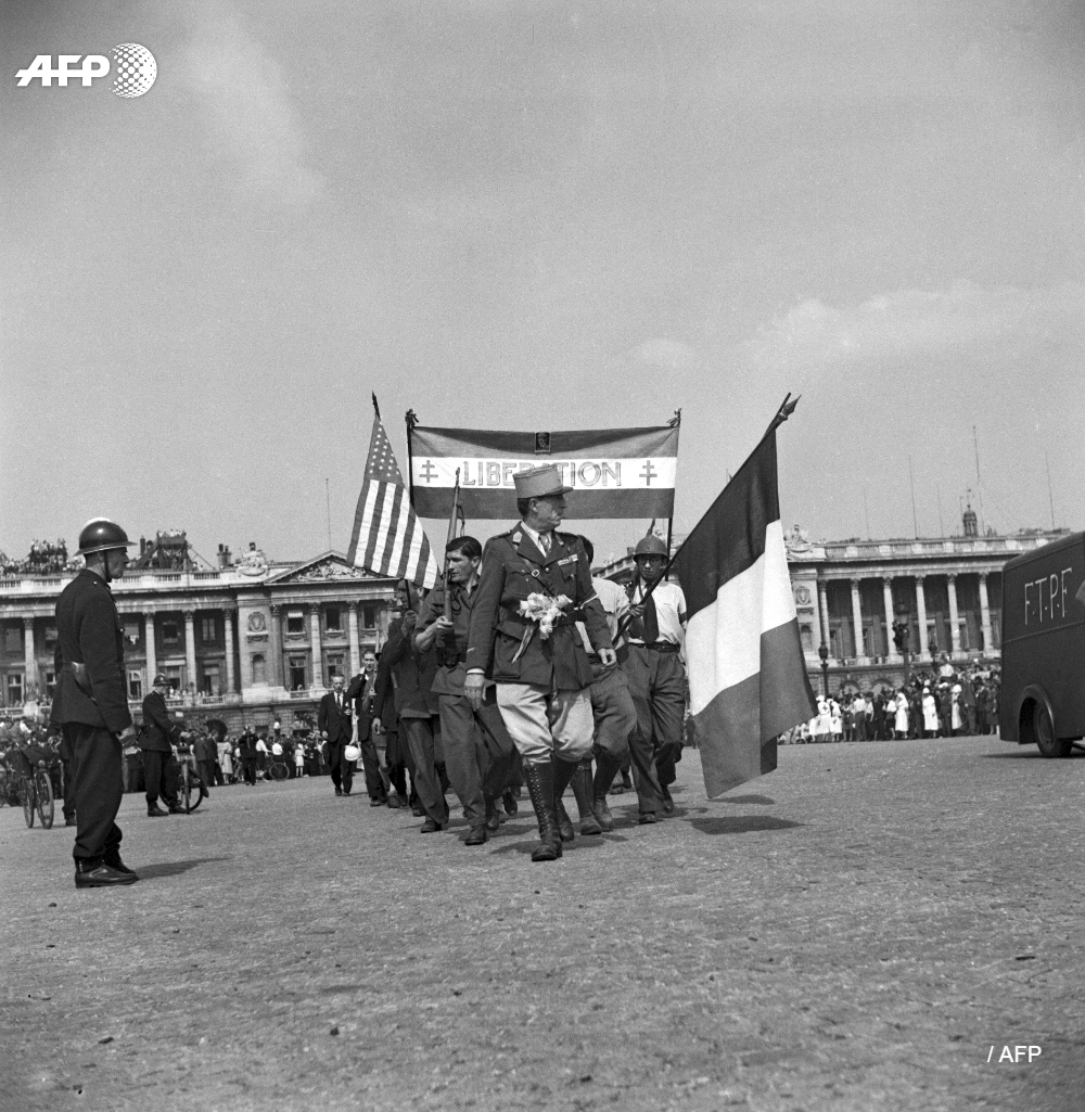 (Des soldats de la Résistance paradent avec les forces alliées pour fêter la victoire de la Libération de Paris)