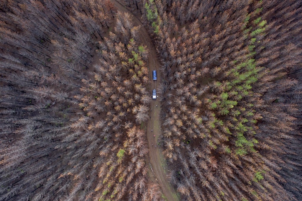 Vue aérienne d'une zone forestière consommée par un feu massif à environ 350 kilomètres au sud de Santiago, le 23 Juin, 2017. Martin Bernetti/AFP